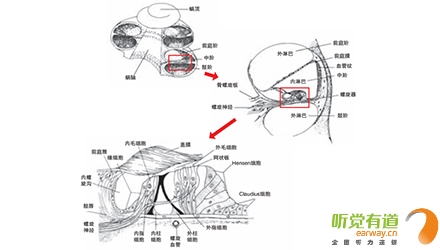 <span style="font-size:16px;"> 內耳或稱迷路,分為三個部分:半規管、前庭和耳蝸,負責聽覺的是耳蝸部分,外有骨殼,名骨迷路。耳蝸,顧名思義,像蝸牛殼一樣,耳蝸旋繞2.5~2.75圈。骨迷路的內壁被骨性螺旋板分成三部分,這三部分組成了三個錐形管腔(階),外面兩層含有淋巴液,頂部是前庭階,底部是鼓階,中間較小的三角形管腔是中階,又叫膜迷路,其中含有聽神經末梢分支。</span></p><p><span style="font-size:16px;"> </span></p><center><span style="font-size:16px;"><img alt="" src="/upfiles/20181116011946651.png" width="440" height="250" /></span></center><p></p><p><span style="font-size:16px;"> 骨迷路(右)</span></p><p><span style="font-size:16px;"> 鐙骨底板在卵圓窗里活動,振動了前庭階的外淋巴液。前庭階和鼓階在蝸孔相匯合,鼓階的另一端是圓窗,正好在卵圓窗和鐙骨底板的下方。中階被薄膜包裹,處于前庭階和鼓階之間,并與它們完全隔離。鐙骨底板在聲波的作用下,推動卵圓窗,使耳蝸內的淋巴液產生波動。顳骨很硬,淋巴液的壓力不能使之產生任何活動,因此,當鐙骨底板向里推動淋巴液時,淋巴液應有一個去處,圓窗部位就是淋巴液流動的方向。中階和前庭階有極薄的膜相隔離,而基底膜分隔中階和鼓階,基底膜是中階里螺旋器的根據地。中階的外壁由螺旋韌帶和微血管叢組成。血管叢可分泌內淋巴液,是內淋巴液化學成分的主要來源,內淋巴液是維持毛細胞功能的必要物質?;啄ど嫌兄е毎?、內毛細胞、外毛細胞和膠狀蓋膜等形成的螺旋器,又名Corti’s器。</span></p><p><span style="font-size:16px;"> </span></p><center><span style="font-size:16px;"><img alt="" src="/upfiles/201811160119529073.png" width="440" height="250" /></span></center><p></p><p><span style="font-size:16px;"> 耳蝸截面圖</span></p><p><span style="font-size:16px;"> 毛細胞是聽覺細胞,3500個內毛細胞和12000個外毛細胞很有序的排列著。普遍認為是外毛細胞比內毛細胞敏感35dB,因此更容易被大聲和耳毒藥物損害。蓋膜是一種膠狀物質,內側附在支持細胞上,其余部分覆蓋著毛細胞。毛細胞上的纖毛叢就埋在蓋膜里。淋巴液的波動或蓋膜的運動,可影響到毛細胞。淋巴液的波動使蓋膜產生猶如鋼琴鍵般的“剪切運動”,刺激毛細胞底部的神經末梢,產生神經沖動。耳蝸底部,離卵圓窗最近處,對高頻發生響應,耳蝸頂部,即遠離卵圓窗的地方,對低頻發生響應,中頻響應介于頂和底之間。</span></p><p><span style="font-size:16px;"> 更多詳情請登錄m.sdhuijia.cn</span></p>" />