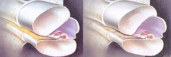 膜迷路積水致膜迷路脹破,內外淋巴液混合,刺激神經感覺細胞導致眩暈、耳鳴、耳聾,裂口愈合則病變暫時恢復。下圖左為前庭膜膨大,右圖為前庭膜破裂,內外淋巴交混。
