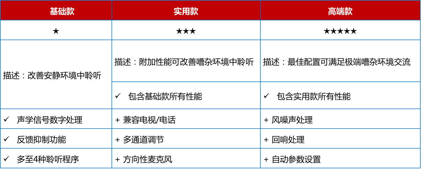 <span style="font-size:16px;"> 助聽(tīng)器價(jià)格取決于機(jī)器的檔次,而檔次由內(nèi)含的技術(shù)種類(lèi)決定。助聽(tīng)器檔次大致可分為基礎(chǔ)款、實(shí)用款、高端款。這三種檔次的區(qū)別請(qǐng)參見(jiàn)下表:</span></p><p style="text-align: center;"><span style="font-size:16px;"><img src="/upfiles/201808150226553383.png" width="640" alt="" /><br /></span></p><p><span style="font-size:16px;"> 那么,如何應(yīng)該選擇哪種檔次的助聽(tīng)器呢?</span></p><p><span style="font-size:16px;"> 選擇助聽(tīng)器時(shí)主要需要考慮兩大因素。首先要考慮的就是弱聽(tīng)人士的聽(tīng)力損失程度,其次要考慮的就是弱聽(tīng)人士的日常生活方式。比方說(shuō),某位弱聽(tīng)人士是中度聽(tīng)力損失,日常在家為主,那么實(shí)用款檔次助聽(tīng)器通常可以滿足TA的需求。</span></p><p><span style="font-size:16px;"> 當(dāng)然,這里只是為助聽(tīng)器選配提供了大致方向,如何選配仍然需要具體情況具體分析,最好還是需要跟驗(yàn)配師面對(duì)面溝通。</span></p><p><span style="font-size:16px;"> 1、高端款助聽(tīng)器</span></p><p><span style="font-size:16px;"> 不同廠家的高端款助聽(tīng)器均代表了各自的尖端技術(shù),并致力于提供最佳的音質(zhì)。</span></p><p><span style="font-size:16px;"> 這類(lèi)助聽(tīng)器高端之處在于自動(dòng)適應(yīng)各種聆聽(tīng)環(huán)境,最優(yōu)化佩戴者的聆聽(tīng)清晰度和舒適度,讓佩戴者在極度嘈雜的環(huán)境中,如咖啡館,也能清晰地聽(tīng)到同伴的言語(yǔ)聲。常見(jiàn)性能包括:</span></p><p><span style="font-size:16px;"> (1) 多種外觀、顏色可選;</span></p><p><span style="font-size:16px;"> (2) 環(huán)境自適應(yīng);</span></p><p><span style="font-size:16px;"> (3) 360°信號(hào)追蹤;</span></p><p><span style="font-size:16px;"> (4) 兼容各種藍(lán)牙設(shè)備。</span></p><p><span style="font-size:16px;"> 高端款助聽(tīng)器為什么能夠自動(dòng)適應(yīng)各種聆聽(tīng)環(huán)境呢?這是因?yàn)樽笥覂蓚?cè)的高端款助聽(tīng)器能夠相互“通電報(bào)”,精準(zhǔn)判斷所處的聆聽(tīng)環(huán)境并自主學(xué)習(xí),給出最佳的助聽(tīng)設(shè)置。</span></p><p><span style="font-size:16px;"> 比如,您經(jīng)常出入一家書(shū)店,每次您進(jìn)入這家書(shū)店時(shí)總是習(xí)慣性地將音量調(diào)低2分貝;長(zhǎng)此以往,當(dāng)您再次進(jìn)入該書(shū)店時(shí),兩臺(tái)助聽(tīng)器將會(huì)默契地降低2分貝。</span></p><p><span style="font-size:16px;"> 360°信號(hào)追蹤可以幫助佩戴者建立更佳的空間感知,對(duì)所處環(huán)境有充足的把控和預(yù)判,避免一些潛在的危險(xiǎn)。而當(dāng)助聽(tīng)器連接至各種藍(lán)牙設(shè)備時(shí),聆聽(tīng)清晰度會(huì)更高,且不會(huì)打擾其他人。</span></p><p><span style="font-size:16px;"> 比如家人總是抱怨您把電視機(jī)聲音開(kāi)得太大,拒絕跟您一起觀看電視時(shí),您可以選配能夠兼容電視的助聽(tīng)器,并進(jìn)行獨(dú)立的音量調(diào)節(jié),而家人只需設(shè)置為常規(guī)音量即可。高端款助聽(tīng)器的價(jià)位一般在15000以上。</span></p><p style="text-align: center;"><span style="font-size:16px;"><img src="/upfiles/201808150228328500.jpg" alt="" /><br /></span></p><p><span style="font-size:16px;"> 2、實(shí)用款助聽(tīng)器</span></p><p><span style="font-size:16px;"> 實(shí)用款助聽(tīng)器的價(jià)格一般在8000~15000之間。實(shí)用款助聽(tīng)器包含一定的降噪技術(shù)和言語(yǔ)提升功能,可以滿足大多數(shù)環(huán)境中的聆聽(tīng)需求。部分廠家的實(shí)用款助聽(tīng)器也可兼容各種藍(lán)牙設(shè)備。實(shí)用款助聽(tīng)器的突出性能大致包括:</span></p><p><span style="font-size:16px;"> (1) 可連接外接音源;</span></p><p><span style="font-size:16px;"> (2) 言語(yǔ)清晰度提升;</span></p><p><span style="font-size:16px;"> (3) 方向性功能。</span></p><p><span style="font-size:16px;"> 3、基礎(chǔ)款助聽(tīng)器</span></p><p><span style="font-size:16px;"> 基礎(chǔ)款助聽(tīng)器的價(jià)位一般在8000以下。基礎(chǔ)款助聽(tīng)器能夠滿足安靜環(huán)境中的交流需求,并具備反饋管理功能。反饋管理功能能夠有效提升佩戴舒適度,避免在日常佩戴過(guò)程中出現(xiàn)尖銳的干擾聲。</span></p><p><span style="font-size:16px;"> 基礎(chǔ)款助聽(tīng)器適用于經(jīng)常在家的弱聽(tīng)人士,若是生活方式比較豐富多彩的弱聽(tīng)人士建議選配其他檔次的助聽(tīng)器。實(shí)用款助聽(tīng)器的突出性能大致包括:</span></p><p><span style="font-size:16px;"> (1) 數(shù)字信號(hào)處理技術(shù);</span></p><p><span style="font-size:16px;"> (2) 反饋管理功能;</span></p><p><span style="font-size:16px;"> (3) 多種聆聽(tīng)程序可選。</span></p><p><span style="font-size:16px;"> 更多詳情請(qǐng)登錄m.sdhuijia.cn。</span></p>" />