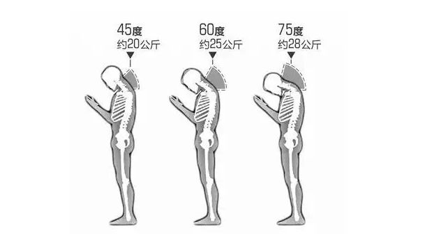 研究數(shù)據(jù)表示,當(dāng)人在低頭45度時(shí),頸椎就得擔(dān)當(dāng)起22公斤的“大任”;當(dāng)頭低到60度的時(shí)候,你的頸椎則要承受25公斤的重量。這可不是個(gè)小數(shù)目,它甚至已經(jīng)超過了7歲小孩的平均體重。
