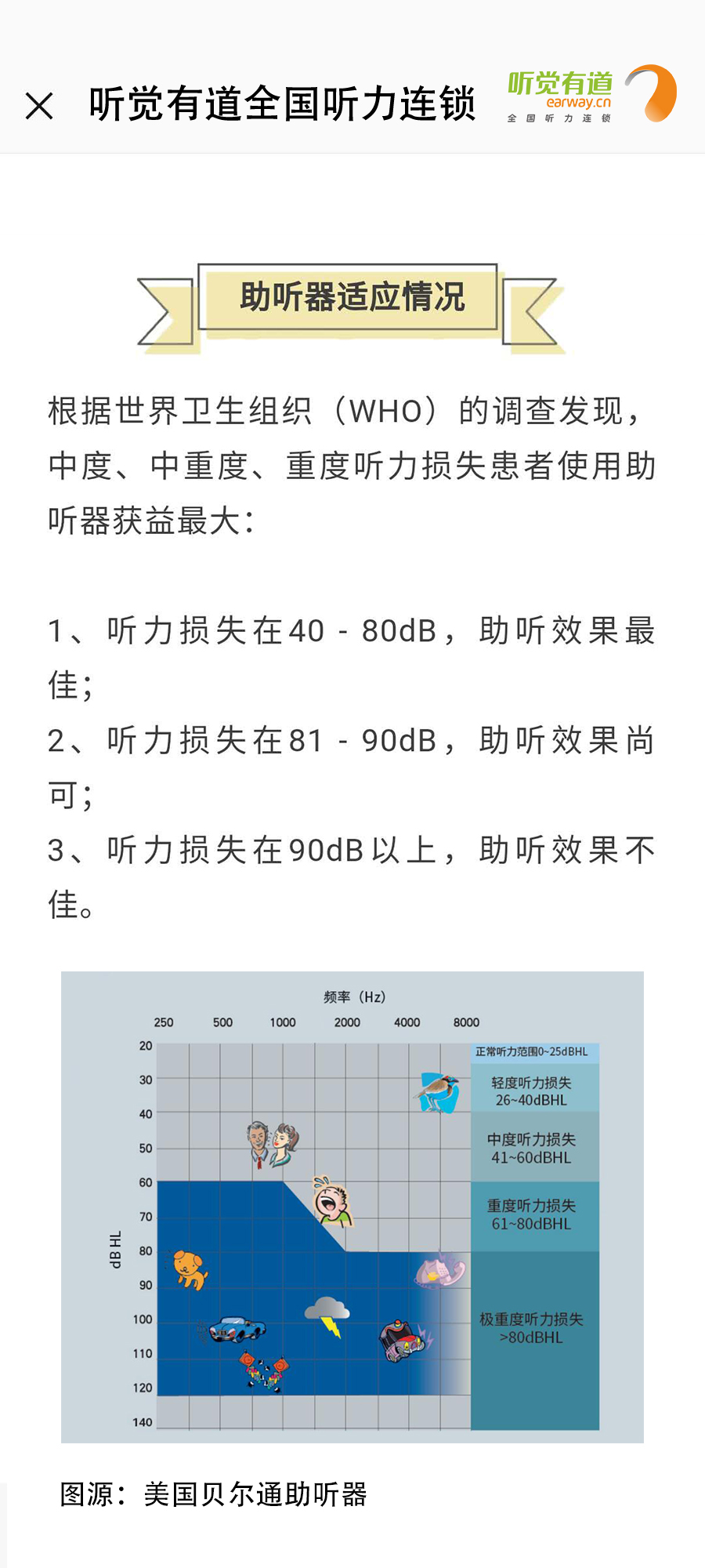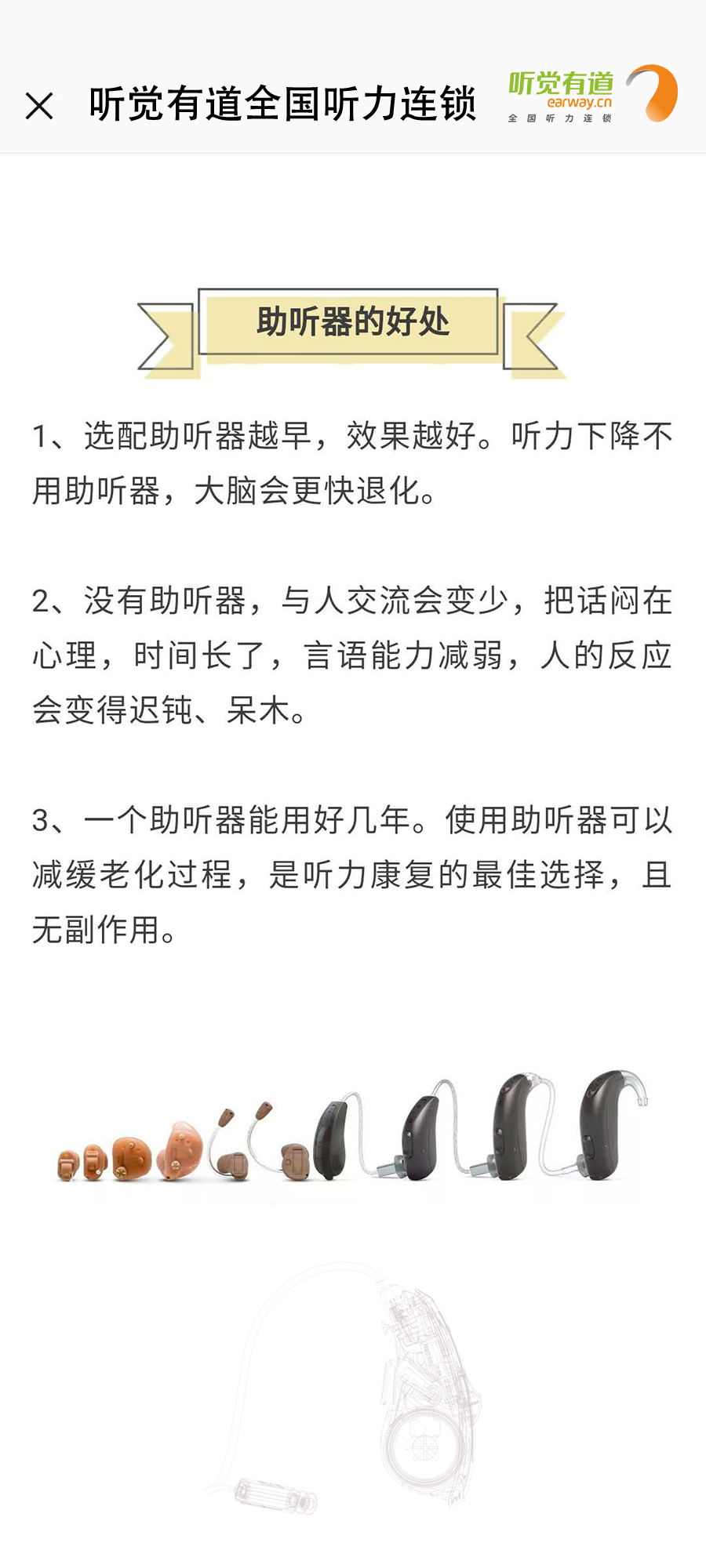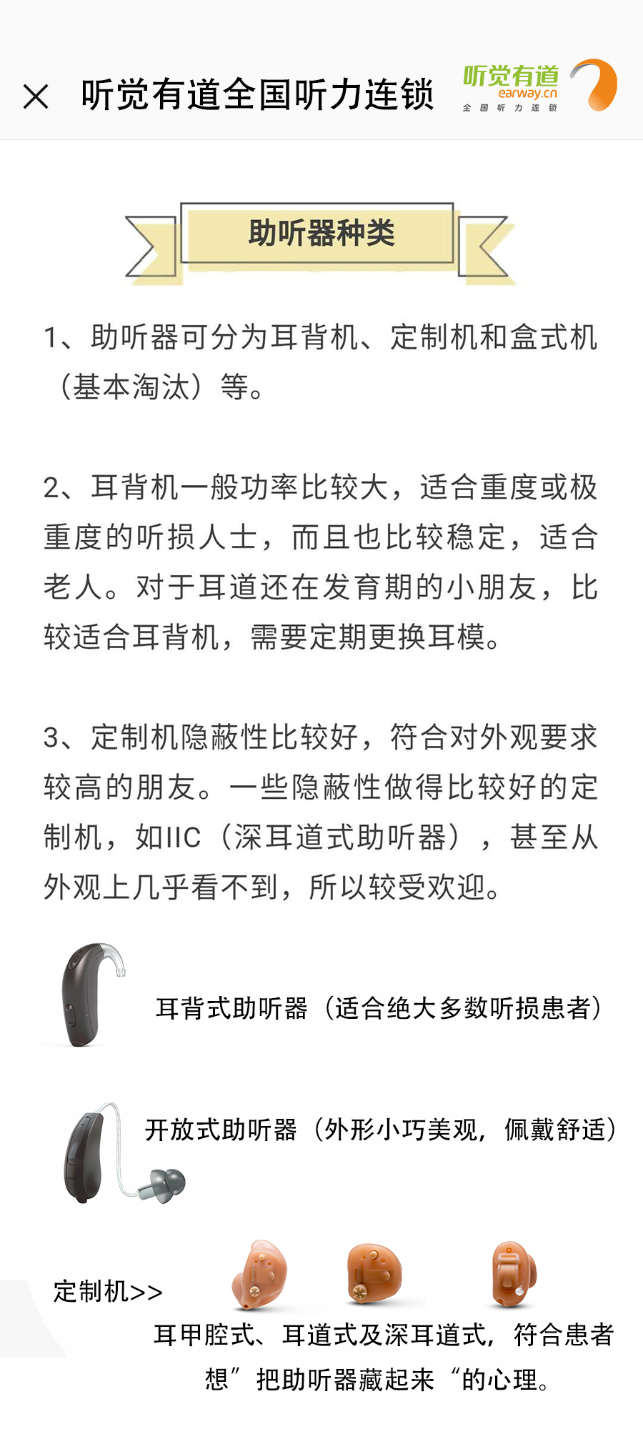 什么是助聽器?長什么樣子?有什么作用?如何使用?這里一一告訴您!</p><p> 助聽器是聽力障礙者使用的輔具,用來補足聽力損傷所造成的缺陷。廣義上講凡能有效地把聲音傳入耳朵的各種裝置都可以看作為助聽器,狹義上講助聽器是一個電聲放大器,通過它將聲音放大,使聽障者聽到了原來聽不清楚、聽不到的聲音。</p><p> 第一:助聽器的種類</p><p style="text-align: center;"><img src="/upfiles/201901180318143583.jpg" width="640" alt="" /><br /></p><p> 第二:助聽器的好處</p><p style="text-align: center;"><img src="/upfiles/201901180318334139.png" width="640" alt="" /><br /></p><p> 第三:如何適應助聽器</p><p style="text-align: center;"><img src="/upfiles/201901180318506440.jpg" width="640" alt="" /><br /></p><p> 第四:選配助聽器流程</p><p style="text-align: center;"><img src="/upfiles/201901180319039646.jpg" width="640" alt="" /><br /></p><p style="text-align: center;"><br /></p><p> 更多詳情請登錄m.sdhuijia.cn</p>" />