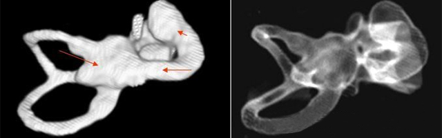 先天性內(nèi)耳畸形的疾病種類繁多,診斷比較困難,隨著高分辨CT和磁共振(MRI)的應(yīng)用,目前診斷率不斷提高。臨床常見的內(nèi)耳畸形包括大前庭導(dǎo)水管綜合癥、先天性耳蝸畸形、米歇爾聽障及沙伊貝聽障。本篇將后三種畸形介紹如下:</p><p> 先天性耳蝸畸形(Congenital cochlear malformation)</p><p> 先天性耳蝸畸形又稱Mondini內(nèi)耳發(fā)育不全,是最常見的一種內(nèi)耳畸形。</p><p> 1、病因</p><p> 本病可為常染色體顯性或隱性遺傳病,也可為非遺傳性因素,如風(fēng)疹病毒感染、過多的放射線暴露以及反應(yīng)停類藥物等引起。</p><p> 2、臨床表現(xiàn)</p><p> 先天性耳蝸畸形包括耳蝸扁平、耳蝸發(fā)育不良,特別是第二圈和頂圈發(fā)育不良,兩者合并為一個(gè)腔;前庭擴(kuò)大,巨大的前庭導(dǎo)水管以及半規(guī)管畸形、內(nèi)耳道擴(kuò)大等癥。在具體病例中不一定以上所有的畸形同時(shí)出現(xiàn),可僅出現(xiàn)其中一種或幾種畸形。</p><p> 3、聽力學(xué)表現(xiàn)</p><p> 出生即無聽力,或1~2歲時(shí)才出現(xiàn)聽力減退,主要為感音神經(jīng)性聽障,部分可為混合性聽障,有部分患者可長(zhǎng)期保存殘余聽力。個(gè)別患者可有眩暈發(fā)作。</p><p> 4、診斷</p><p> 主要根據(jù)聽力學(xué)表現(xiàn)和影像學(xué)檢查。通過高分辨CT可看到耳蝸畸形。內(nèi)耳MRI顯示膜迷路內(nèi)水充盈,耳蝸扁平,耳蝸第二圈與頂圈間隔缺損,以及半規(guī)管、前庭的畸形。</p><p> </p><center><img alt="" src="/upfiles/201903250158493159.png" width="640" height="200" /></center><p></p><p> 先天性耳蝸畸形伴前庭和外半規(guī)管發(fā)育不良</p><p> 5、治療</p><p> 目前尚無有效的治療方法。如有殘余聽力,可佩帶助聽器后進(jìn)行語言康復(fù)。無殘余聽力或極重度聽障患者可考慮人工耳蝸植入。</p><p> 米歇爾聽障(Michel’s deafness)</p><p> 屬常染色體顯性遺傳,是最嚴(yán)重的內(nèi)耳畸形,內(nèi)耳可完全未發(fā)育,可伴有其它器官的畸形和智力障礙。</p><p> 1、診斷</p><p> 主要依靠顳骨高分辨CT和內(nèi)耳MRI。</p><p> </p><center><img alt="" src="/upfiles/201903250158577271.png" width="640" height="160" /></center><p></p><p> 雙側(cè)內(nèi)耳畸形:左側(cè)無內(nèi)耳迷路及內(nèi)耳道機(jī)構(gòu),為米歇爾畸形;右側(cè)空耳蝸及前庭擴(kuò)大,為先天性耳蝸畸形</p><p> 2、治療</p><p> 目前無特殊辦法,此類病例不適合行人工耳蝸植入術(shù),但是聽覺腦干植入術(shù)的適應(yīng)癥,其效果有待進(jìn)一步證實(shí)。</p><p> 沙伊貝聽障(Scheibe dysplasia)</p><p> 為常染色體隱性遺傳,是最輕的內(nèi)耳畸形,畸形僅限于蝸管和球囊,故又稱耳蝸球囊型畸形。</p><p> 1、診斷</p><p> 主要根據(jù)先天性聽損和MRI檢查</p><p> 2、治療</p><p> 此病可選擇性地行人工耳蝸植入術(shù)。</p><p> 更多詳情請(qǐng)登錄聽覺有道助聽器m.sdhuijia.cn</p>" />