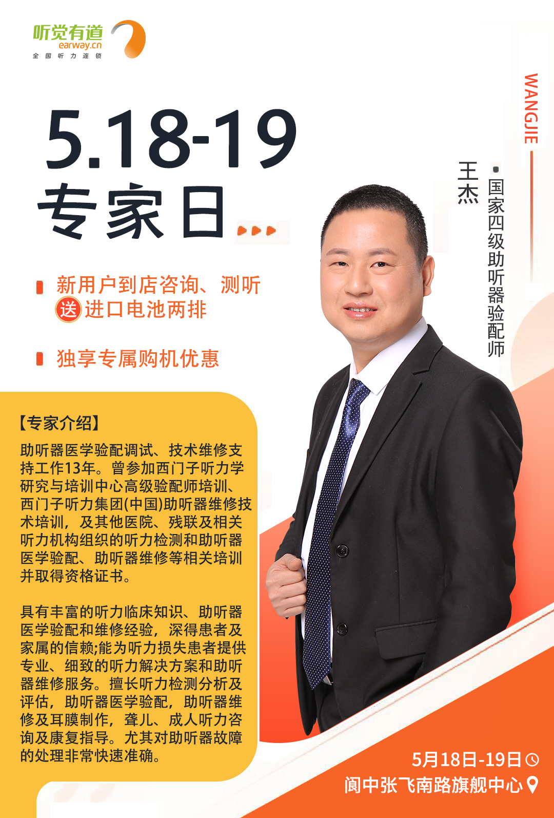 <span style="white-space:pre"> </span>為了更好地服務聽損人士,帶來高質量的聆聽感受,聽覺有道全國聽力連鎖將持續開展專家入店活動。<br /></span><p><span style="font-size:16px;">  專家日現場,聽覺有道金牌聽力專家將為您解答聽力相關問題,調試和驗配助聽器,讓您能夠更好地聆聽這個世界的美好。</span></p><p style="text-align: center;"><img src="/upfiles/202104300114022603.jpg" width="640" alt="" /><br /></p><p style="text-align: center;"><br /></p><span style="font-size:16px;">  <strong>活動預告<br /><br />  聽覺有道專家入店行程表</strong><br /><br />  聽覺有道東莞塘廈驗配中心<br />  時間:5月2日<br />  專家:李冬根<br />  電話:0769-87927386<br />  手機:18923091281<br />  地址:廣東省東莞市塘廈鎮塘廈大道中70-108號(水電三局對面)<br /><br />  聽覺有道達州開江驗配中心<br />  時間:5月6日~7日<br />  專家:羅夢薇<br />  電話:0818-8222079<br />  手機:19182813889<br />  地址:四川省達州市開江縣新寧鎮龍池街77號(開江縣人民醫院正門對面)<br /><br />  聽覺有道成都邛崍驗配中心<br />  時間:5月6日~7日<br />  專家:王蕾<br />  電話:028-88734181<br />  手機:18908177682<br />  地址:四川省邛崍市鳳凰大道484號高宇南庭(醫療中心醫院對面)<br /><br /></span><span style="white-space:pre"><span style="font-size:16px;"> 聽覺有道閬中張飛南路旗艦中心<br />  時間:5月18日~19日<br />  專家:王杰<br />  電話:0817-6250177<br />  手機:17398130629<br /></span></span><p><span style="white-space:pre"><span style="font-size:16px;">  地址:四川省閬中市張飛南路126號(人民醫院正對面)</span></span></p><p style="text-align: center;"><img src="/upfiles/202104300134599048.jpg" width="640" alt="" />&nbsp;<img src="/upfiles/202104300134592952.jpg" width="640" alt="" />&nbsp;<img src="/upfiles/202104300134592080.jpg" width="640" alt="" /><br /></p><p style="text-align: center;"><img src="/upfiles/202104300135382254.jpg" width="640" alt="" /><br /></p><p style="text-align: center;"><br /></p>" />