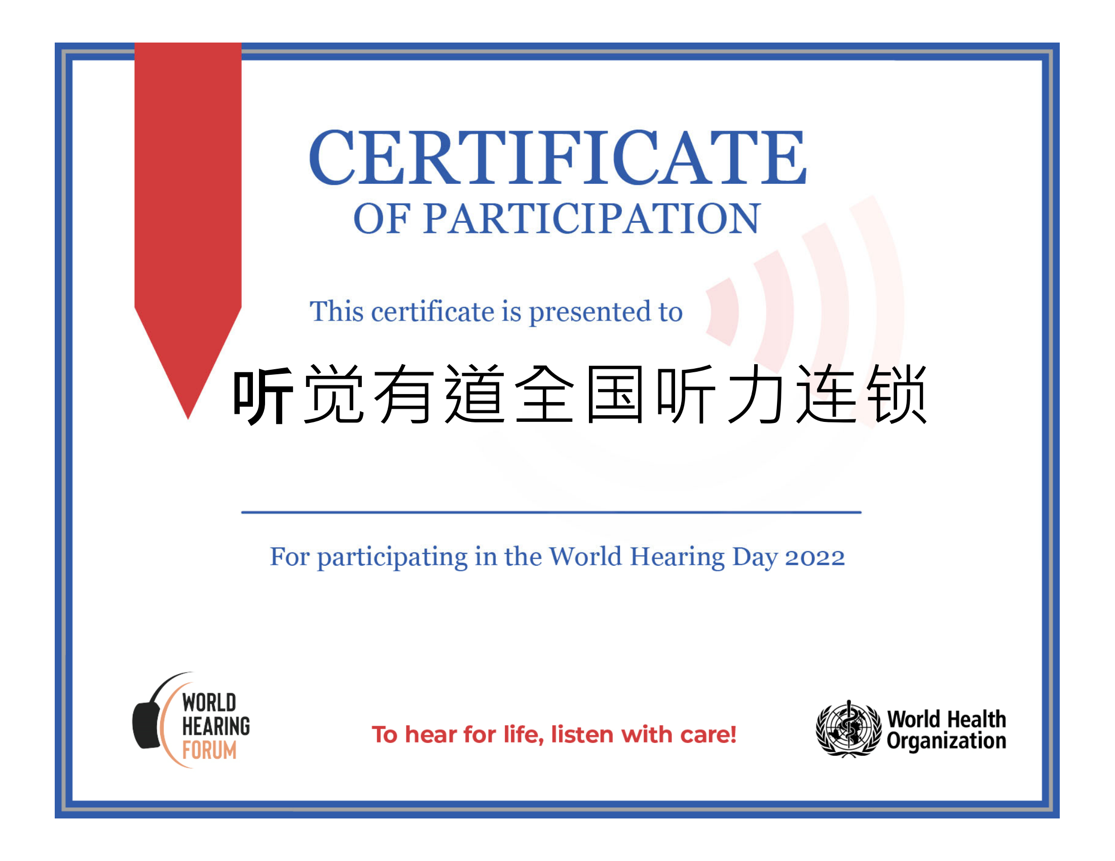 <span style="white-space:pre"> </span>每年3月3日,是世界聽力日,也是全國愛耳日。<br /><br /> WHO(世界衛(wèi)生組織)對聽覺有道全國聽力連鎖在世界聽力日活動中所作出的努力,給予充分肯定,并于5月10日授予榮譽證書。<br /><br /> 2022年3月,聽覺有道在全國范圍開展大規(guī)模的愛耳護耳宣傳科普活動。<br /><br /></span><p><span style="font-size:16px;"> 我們的專業(yè)助聽器驗配師不遺余力,為當?shù)鼐用駲z查聽力、宣傳聽力知識、提供聽力解決方案和選配助聽器。</span></p><p style="text-align: center;"><span style="font-size:16px;"><img src="http://m.sdhuijia.cn/upfiles/202205111115147752.png" width="640" style="font-size:16px;" alt="" /><br /></span></p><p><span style="font-size:16px;"> 關愛聽力健康,聆聽精彩未來!聽覺有道一直在行動。</span></p><p><span style="font-size:16px;"><br /></span></p><p><br /></p>" />